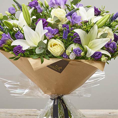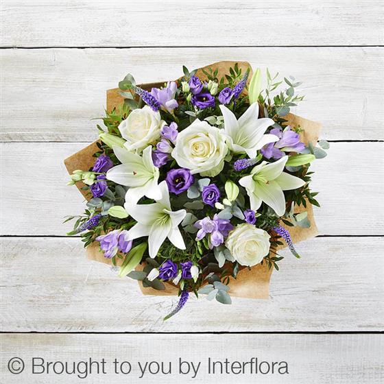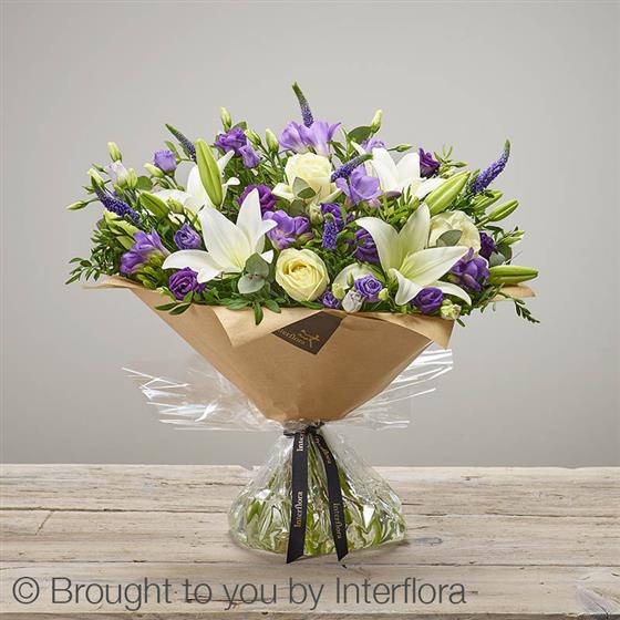 Featuring white LA lily, ivory large headed rose, purple freesia, blue veronica, purple lisianthus, eucalyptus & pistache, presented in gift packaging.