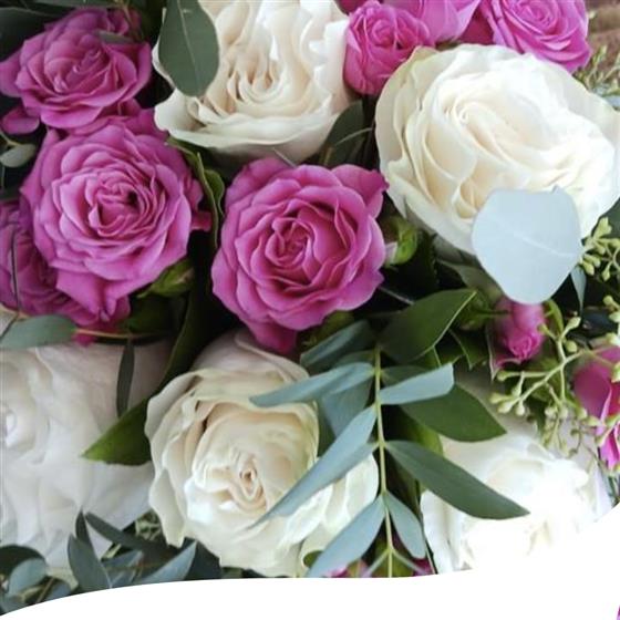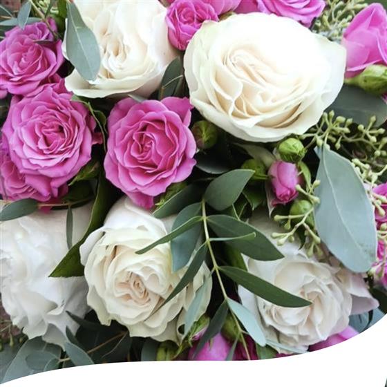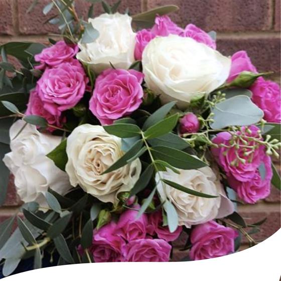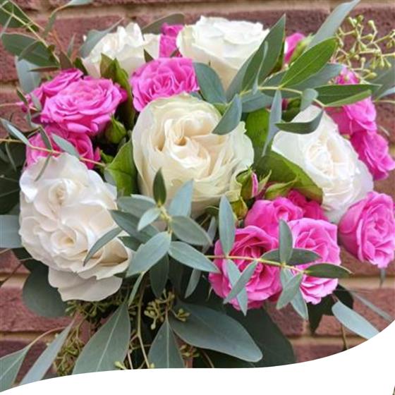 White Moonlight Roses and Pink Lianne Spray Roses into a Bouquet with Parvi Eucalyptus and Mixed Populous Eucalyptus with Berries.