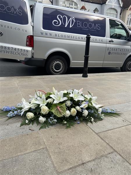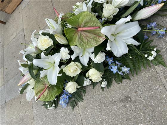 This White, Green and Pale Blue Coffin Spray is made up of Blue Delphiniums, White Lily, White Roses with Green Anthiriums, White carnations and White September. Choice foliage throughout the beautiful piece. Available in 4, 5 and 6 Foot.