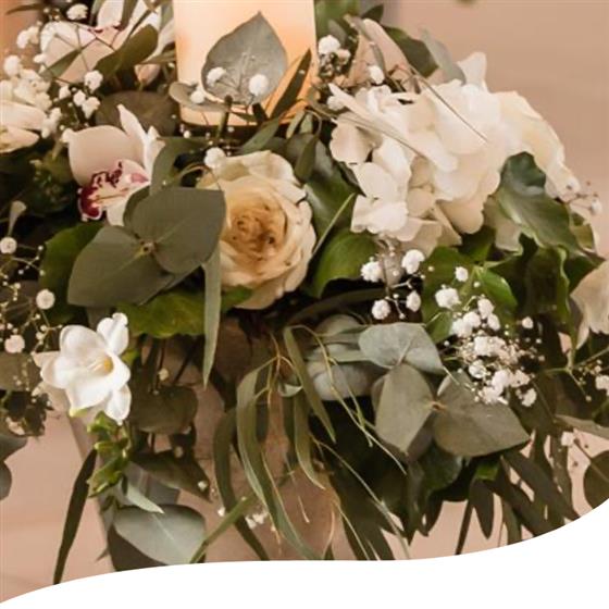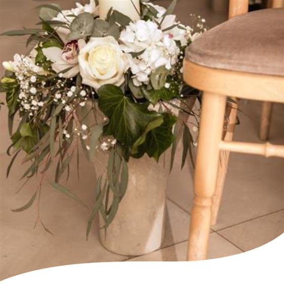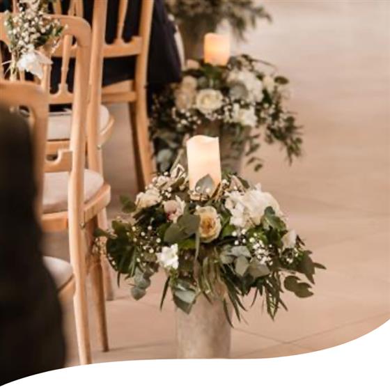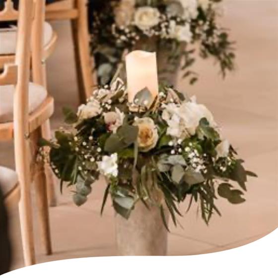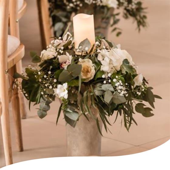 This beautiful arrangement is designed to sit gracefully at the end of the aisle. Our florists have chosen a sophisticated blend of white and cream flowers, displayed in charming cream pots. After the ceremony, these stunning arrangements can be effortlessly moved to enhance your venue decor.