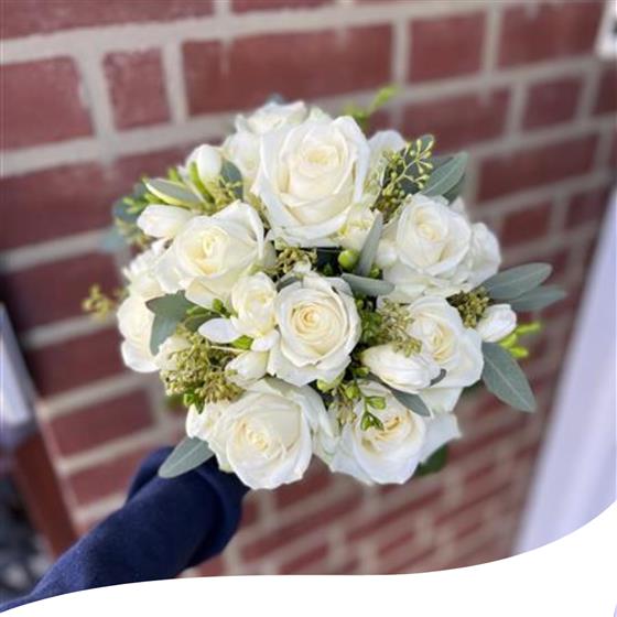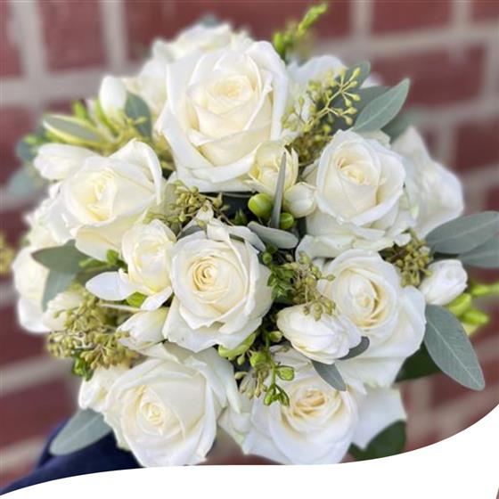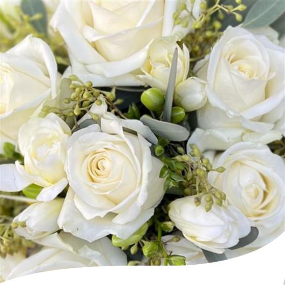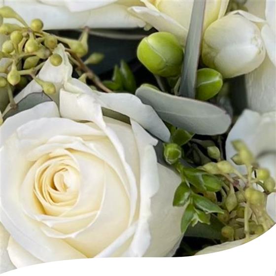 Arranged with berried Eucalyptus in between the delicate freesias. Perfectly open White Avalanche Roses finished with choice of stem wrap but we would recommend a nice white satin ribbon.