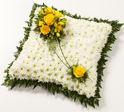 A classic white Chrysanthemum based cushion design with foliage edge, decorated with a spray which includes Roses, Freesias & Chrysanthemums with complementary foliage.