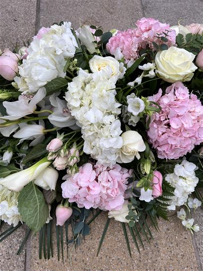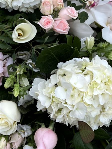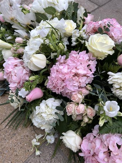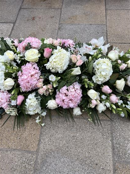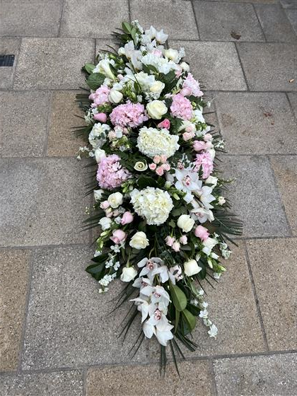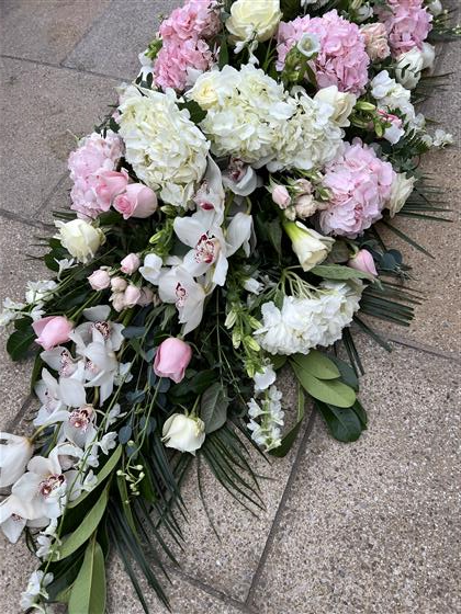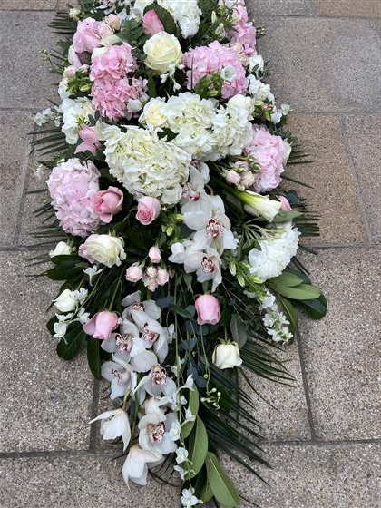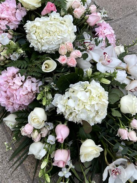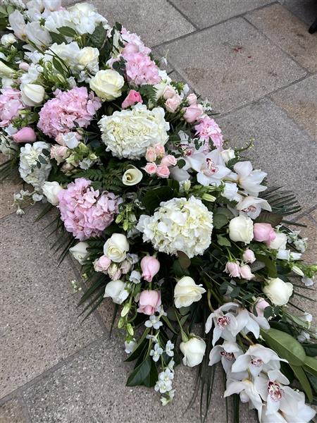 A beautiful coffin spray with white and pink Hydrangeas. Also with mixed white and pink roses. Accompanying Campanula and Spray Roses, With added Cymbidiums and Dendrobium orchids.