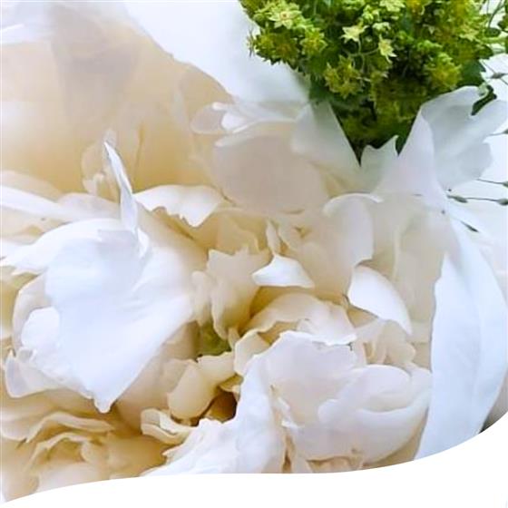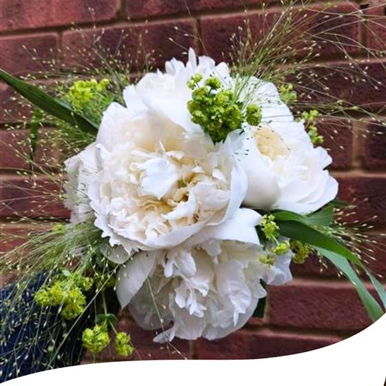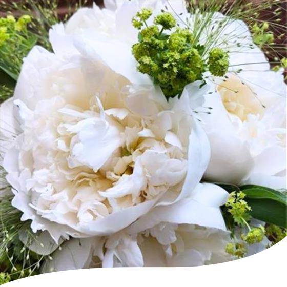 This elegant bouquet features pure White Peonies, complemented by the delicate textures of Fountain Grass and Alchemilla Mollis. With its simple yet stunning design, this bouquet effortlessly combines beauty and sophistication, making it a perfect choice for a classic and refined look.