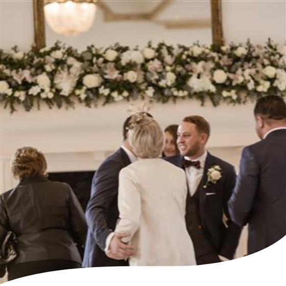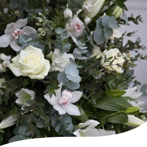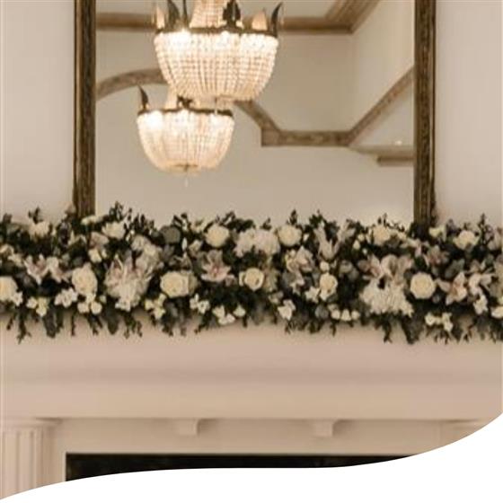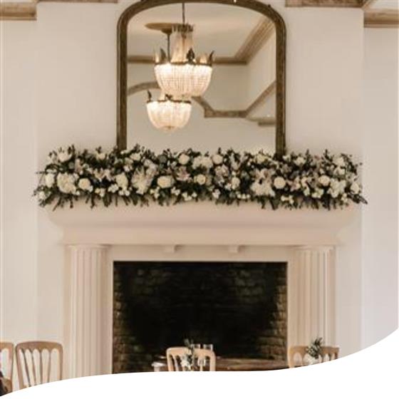 A 2 metre fireplace arrangement of white flowers. Designed to run the length of the fireplace and to be full and raised. We used choice luxury flowers such as Lisianthus, Roses, Cymbidium Orchids, Snowflake Spray Roses, Bouvardia, Brunia, Hydrangeas and Eucalyptus.
