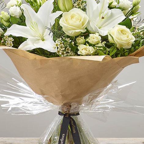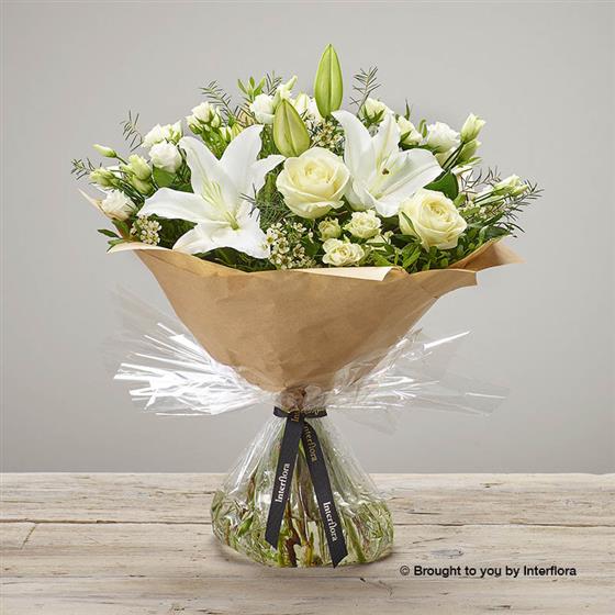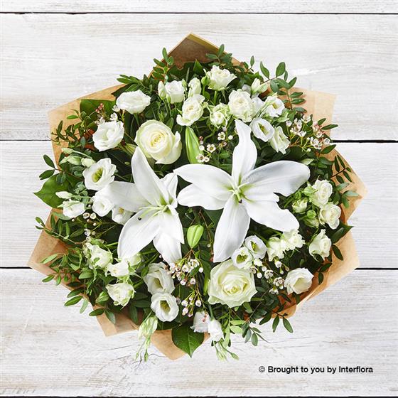 Featuring white germini, white Oriental lilies, white lisianthus, white large headed roses and white ammi, handtied with eucalyptus and salal, presented in gift packaging.