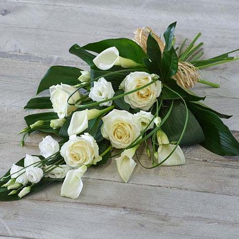 Graceful callas lilies meet large headed roses and rich green foliage in an elegant, neutral design.