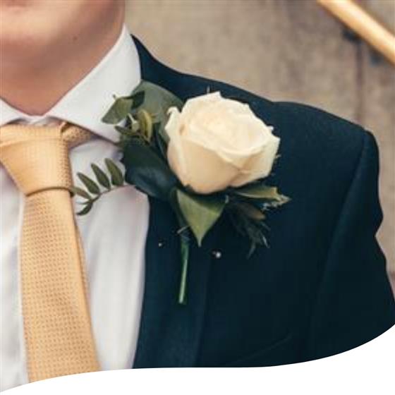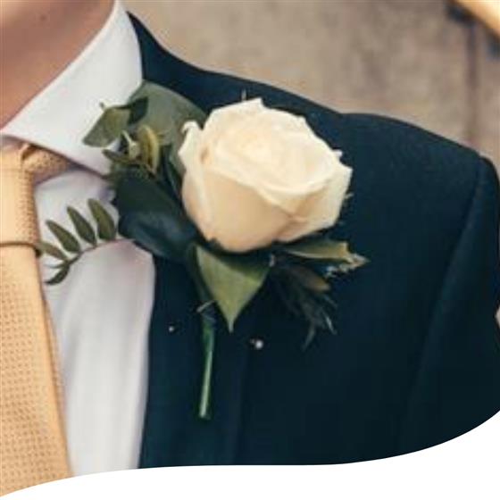 We will use a nice open White Avalanche Rose and accompany it with some mixed foliage. We will wire and wrap all the stems up to keep it fresh and strong through the day.