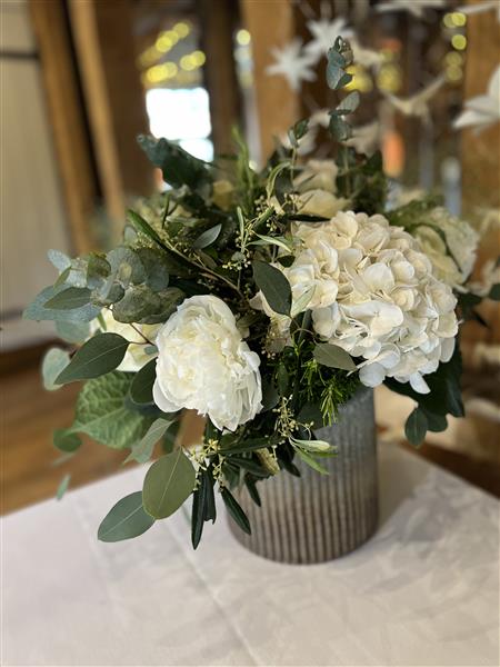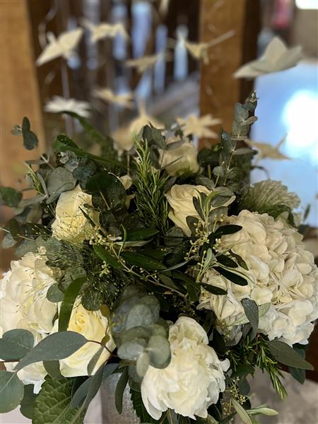 A beautiful vase of flowers perfect for your wedding tables - skilfully arranged by our team of expert florists using white Hydrangeas, White Peonies, White Roses and beautiful Eucalytpus foliage. Add in sprigs of rosemary and fountain grass and these look amazing.
