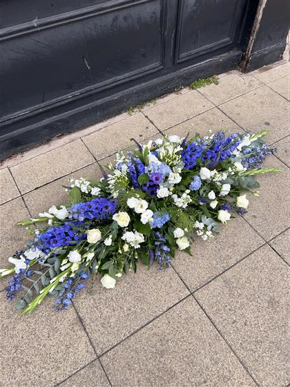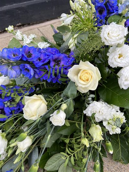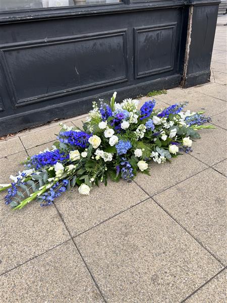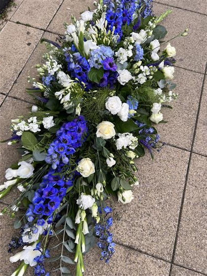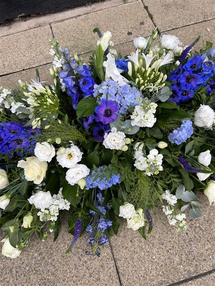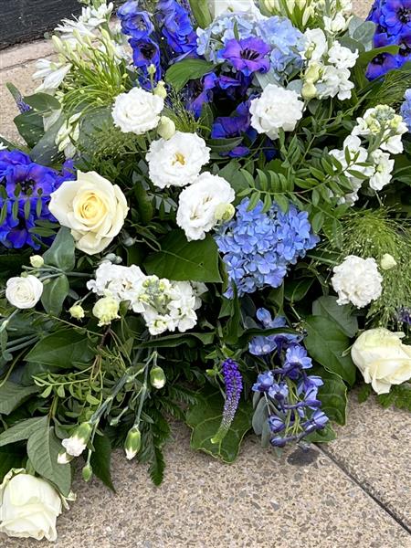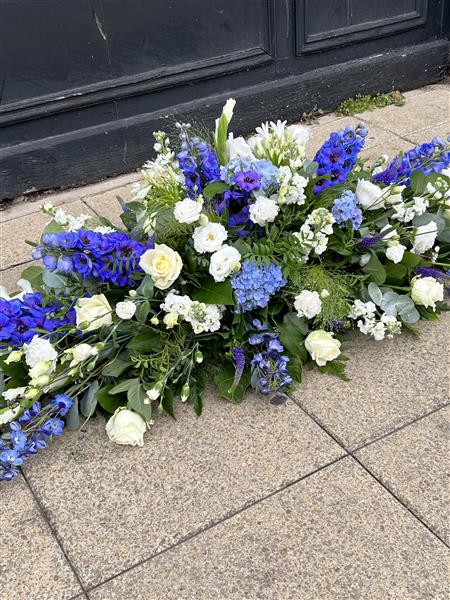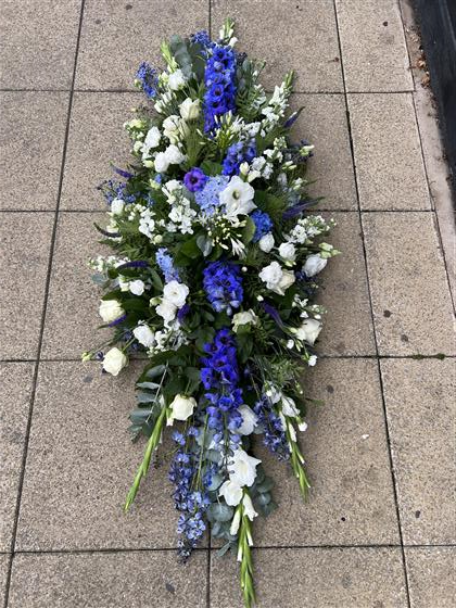 This White and Blue coffin spray is made with Hydrangeas, Delphiniums, Roses, Lisianthus, Veronicas, White and Blue Agapanthus, Stocks, Gladioli and Mixed foliage including eucalyptus.