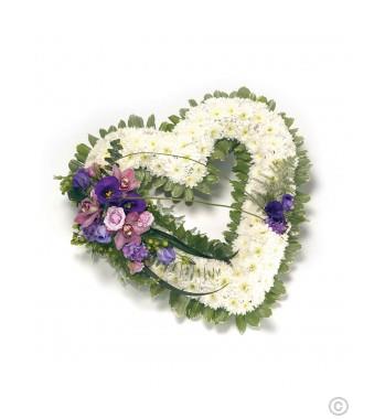 A beautiful open heart tribute in white, green and Purples. The heart is made with a foliage edge and Purple lisianthus and Rose spray with White chrysanthemum base.