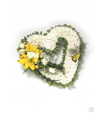 A beautiful open heart tribute in White, Green and Yellow. The heart is made with a foliage edge and yellow Lily and White Rose spray with White chrysanthemum base.