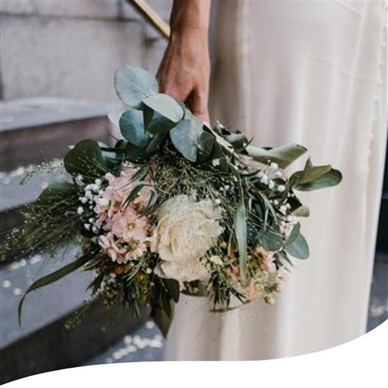 A natural and wild flower bridal bouquet. We will use a nice selection of seasonal peach and white flowers into a hand tied bouquet.