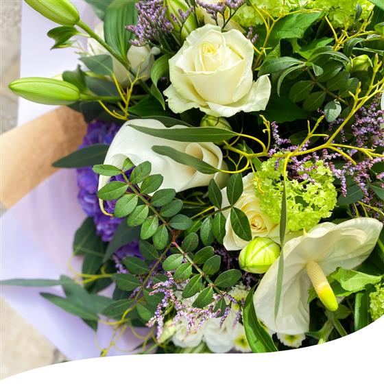 Experience the elegance of our Wimbledon Bouquet, a bespoke arrangement curated by our skilled florists. This stunning hand-tied bouquet features a selection of purple and white flowers, crafted from the finest seasonal blooms.