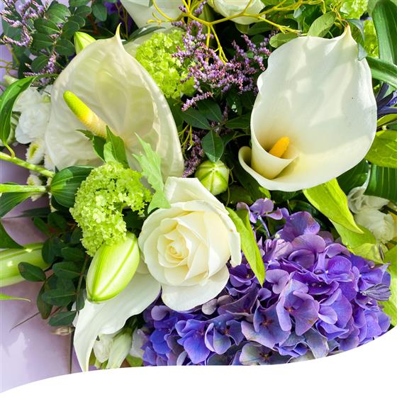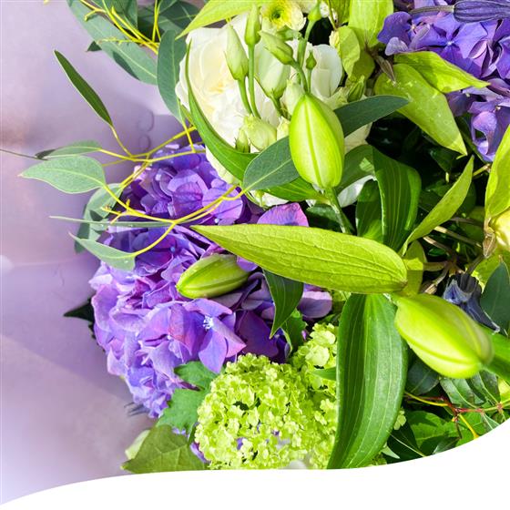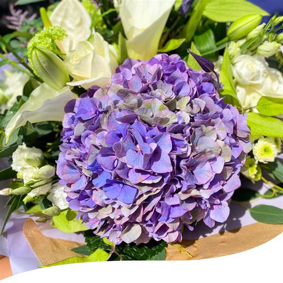Reflecting the colours of Wimbledon, each bouquet is unique and may vary slightly from the image shown. It includes a beautiful mix of Hydrangeas, Roses, Veronicas, Aconitums, Lilies, Cala Lilies, Statice, Lisianthus, Tropical Anthuriums, and Eucalyptus.