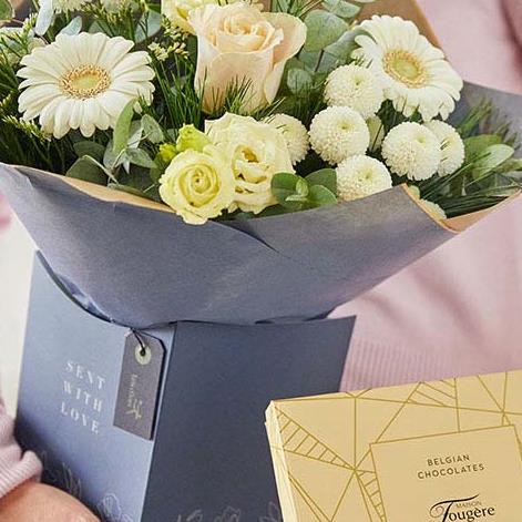 Hand-tied flowers expertly arranged and perfectly presented in a lovely gift box. Frosty tones reminiscent of a winter wonderland