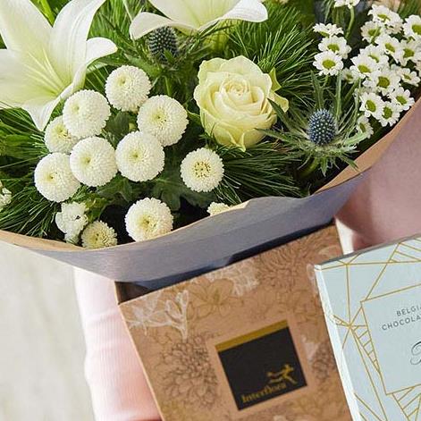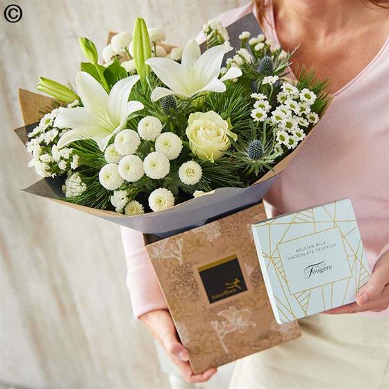 Hand-tied flowers expertly arranged and perfectly presented in a lovely gift box. Frosty tones reminiscent of a winter wonderland