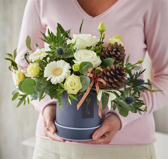 An easy-to-care for arrangement of flowers in a chic hatbox. Reusable hatbox makes a lovely keepsake.