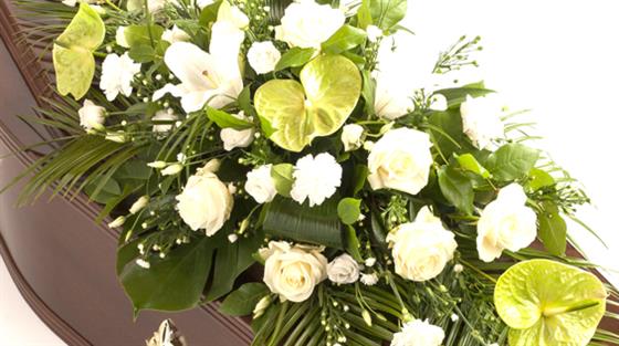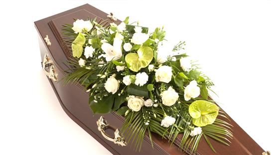 For this woodland coffin spray we mixed luxurious cream roses and lisianthus with white oriental lilies and green anthurium. Delicate September flower and carnations add detail along with pretty ferns and palm leaves.