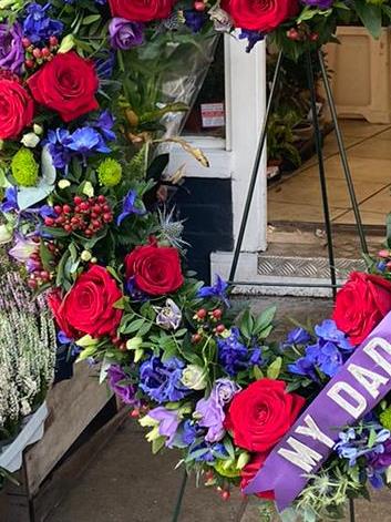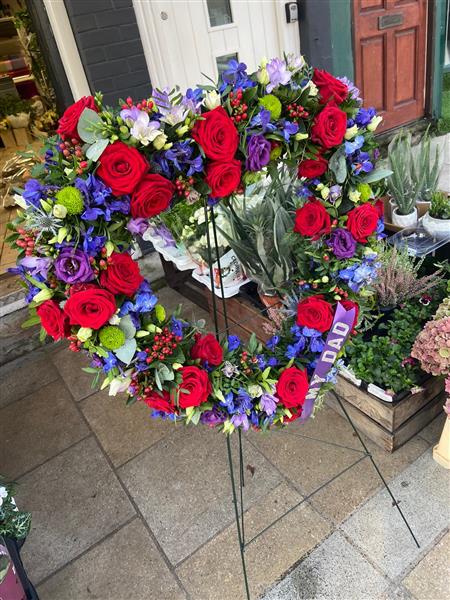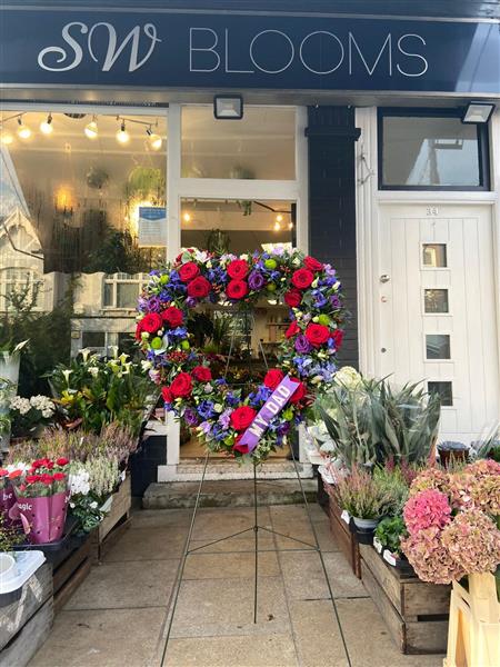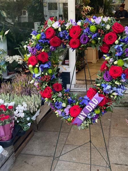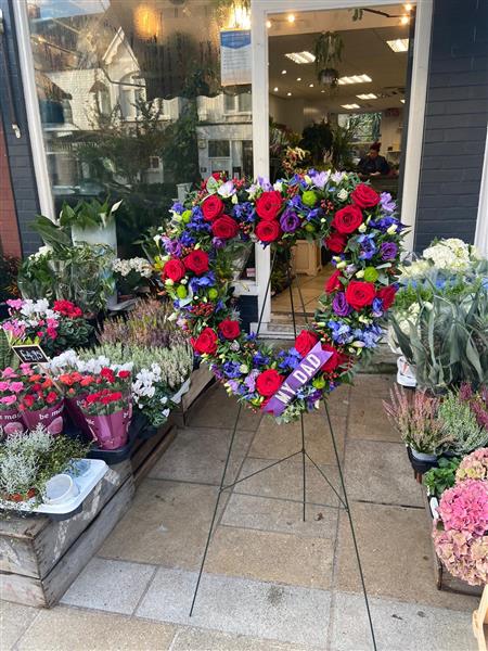 This XL Heart on a stand is a beautiful tribute. Made with the most beautiful flowers. Clusters of Red Roses, Purple Statice, Purple Lisianthus, Lilac Freesia, Lilac Lisianthus, Blue Delphinium, Green Santini, mixed foliage with eucalyptus and Ivy trails.