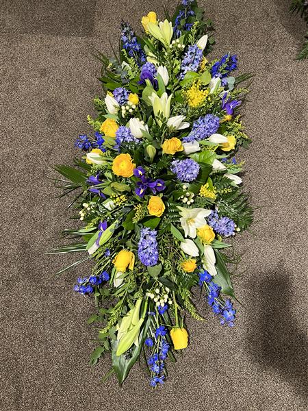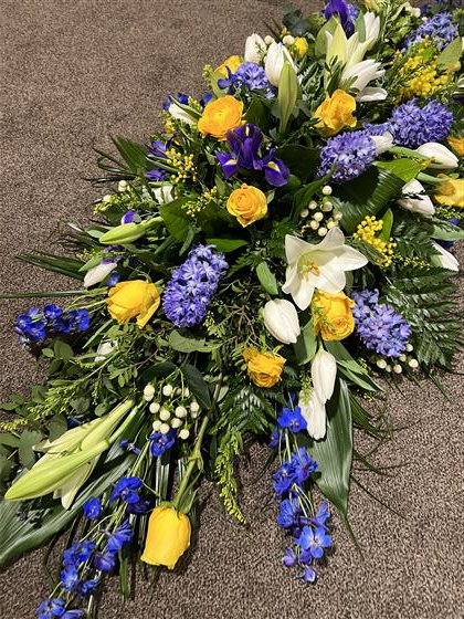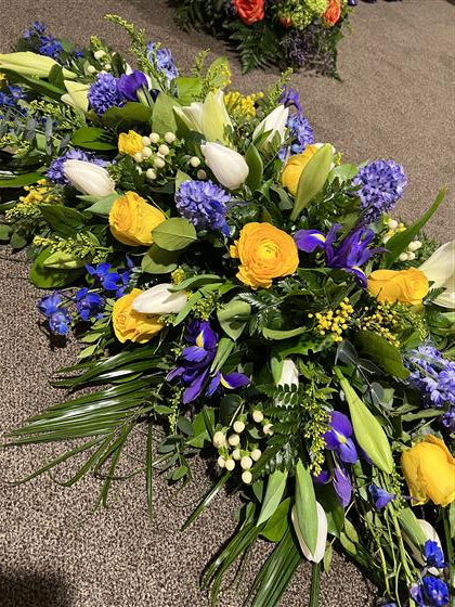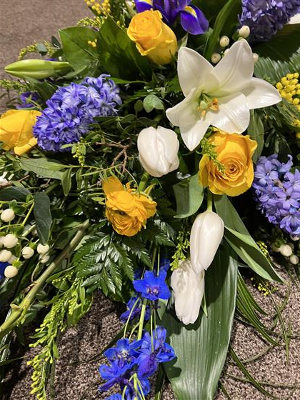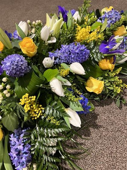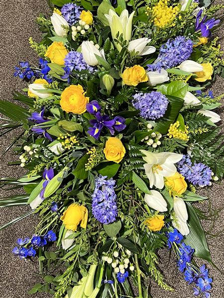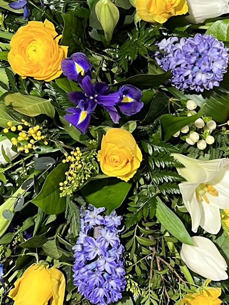 Blue Hyacinths, Blue Delphiniums, Yellow Roses, Mimosa, Yellow Soli, White Tulips, White Lily’s and Ranunculus.