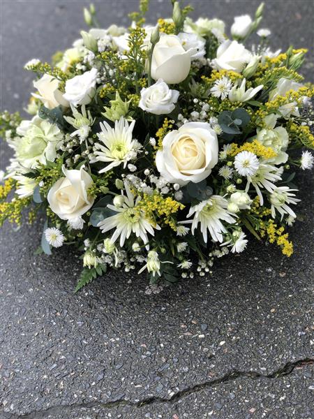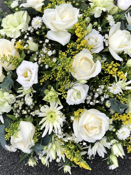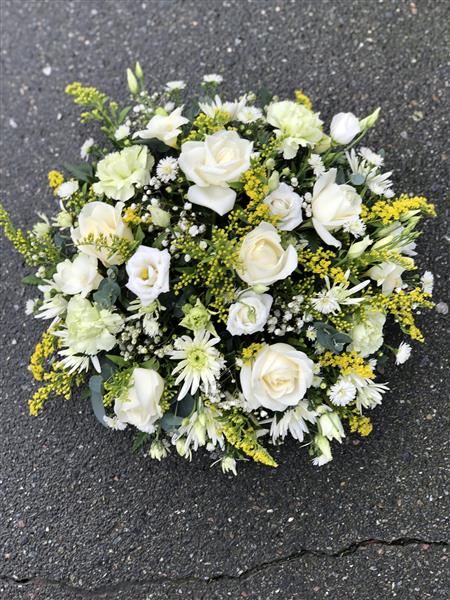 A yellow and White posy arrangement with roses, Soli, Lisianthus, Delianne, Freesia, Gyp and other seasonal flowers.