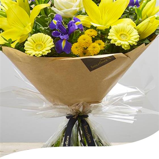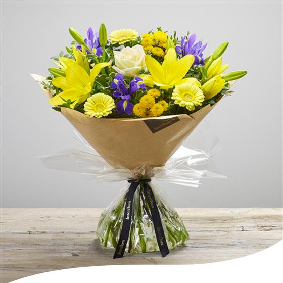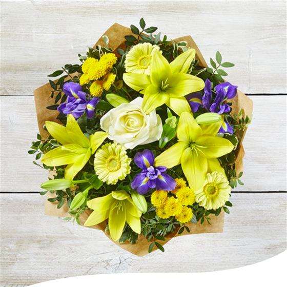 A delightful hand-tied bouquet in vibrant yellow and purple, showcasing an exquisite blend of Gerberas, Lilies, Irises, and Chrysanthemums. Each bloom is carefully selected and arranged to create a lively and striking display. This bouquet arrives aqua-packed to ensure freshness and is beautifully gift-wrapped, making it a perfect choice for any occasion.
