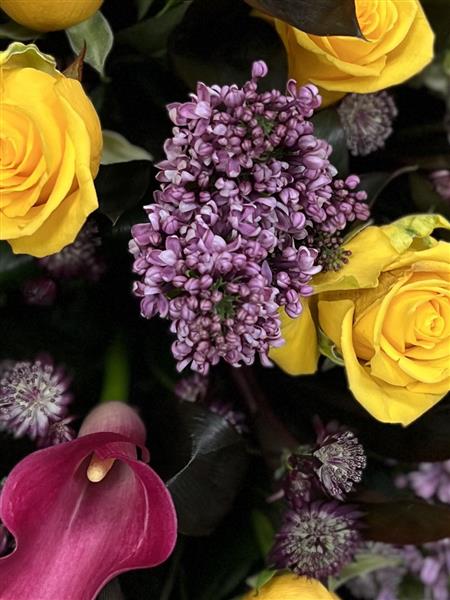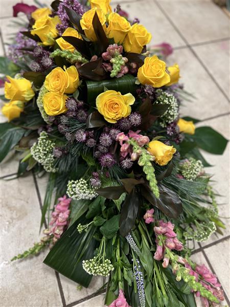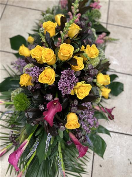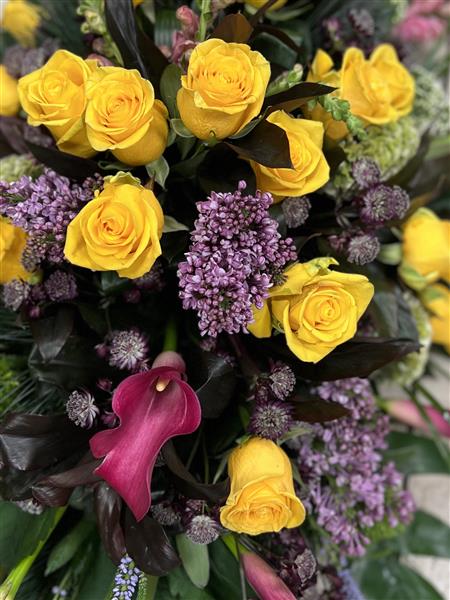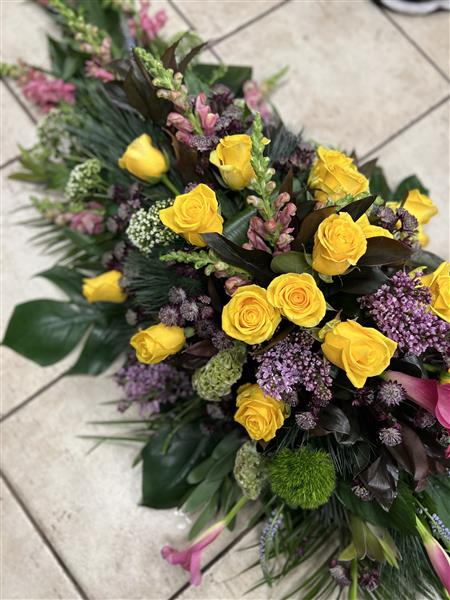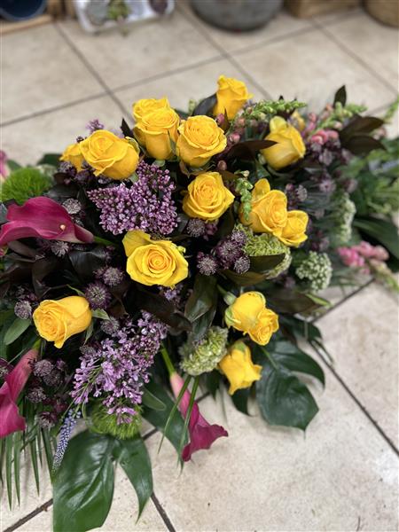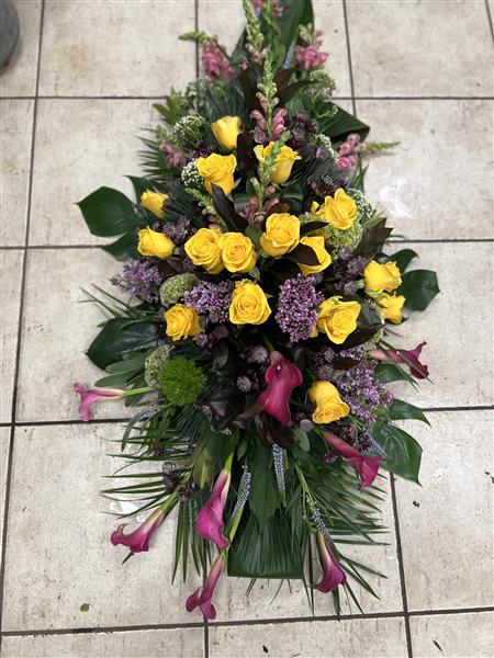 A vibrant and colourful Coffin Spray. Beautifully arranged with bright yellow Roses, Lilac Syringia (which is an SW Blooms favourite) Lilac Veronica’s, Pink Calla Lily, Green Trick Dianthus, Dark Pink Astrantia, White Euphorbium and a selection of nice foliage.