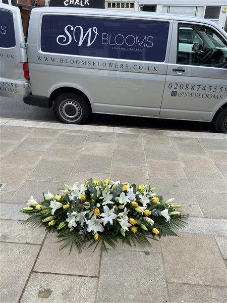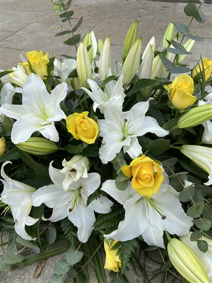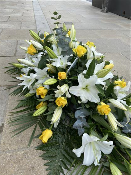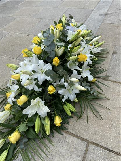 Yellow Roses and White Oriental Lily Coffin Spray. We will get the white Lily’s in a week before the funeral in order to get them open. Yelllow Roses 3 days before to get them open and looking there best for the funeral.