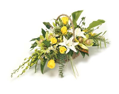 A beautiful handled basket of white, green and yellow flowers, designed using yellow roses, green cymbidium orchids, white oriental lilies, choice foliage and other white mixed flowers.