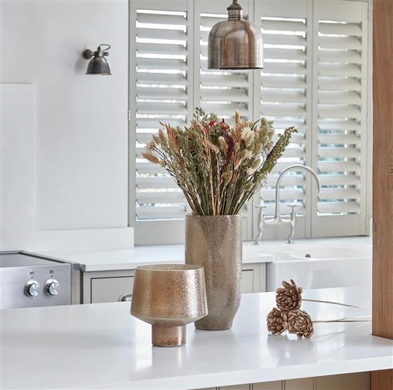 Catching the eye with its premium glaze and metallic gold hue, the Opulent collection brings luxurious style wherever it goes. Curved in structure for an elegant aesthetic, each piece is fully waterproof and lovingly handcrafted from recycled glass for both style and sustainability. Place a fresh bouquet or dried blooms inside and feel enriched by the beauty for days on end.